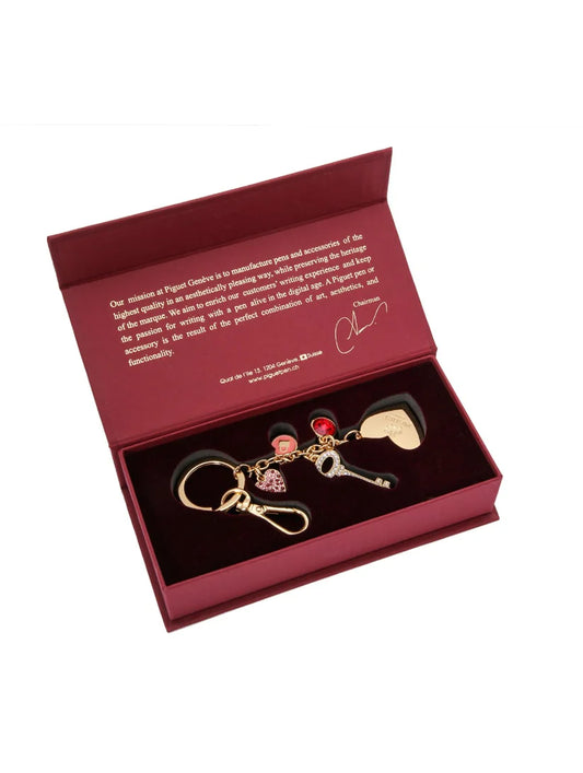 Piguet unveils its first gift set devoted to women Charm l’Doré, the epitome of regal elegance. Cloaked in the radiance of pure 14 karat gold, this majestic set unites two timeless treasures: the Sigma V l’Doré signature pen, a creation bestowed upon humanity by the master artisans of Piguet, and the house’s emblematic Charm d’Amour keyholder.